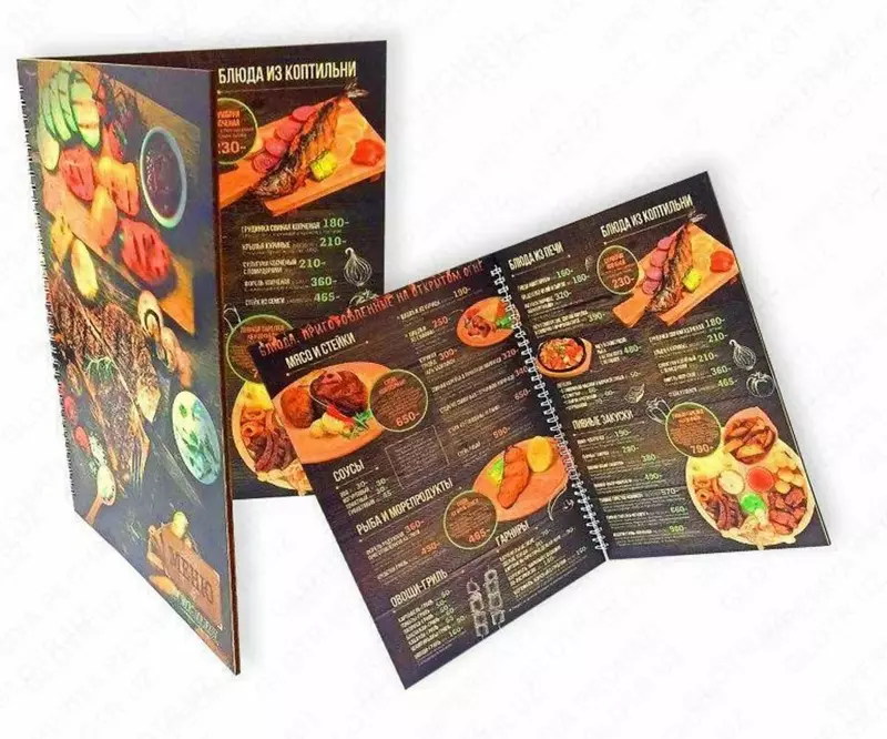 Bu yerda siz turli formatdagi zamonaviy va rang-barang menyularga buyurtma berishingiz mumkin. Ularni ishlab chiqarish uchun biz yuqori sifatli materiallar va professional uskunalardan foydalanamiz, muassasangizning individual xususiyatlarini hisobga olgan holda dizaynni diqqat bilan tanlaymiz. O'z ishlab chiqarish, doimiy sifat nazorati, muammolarni hal qilishda ijodiy va ijodiy yondashuv mijozlarimiz uchun noyob loyihalar yaratish imkonini beradi.